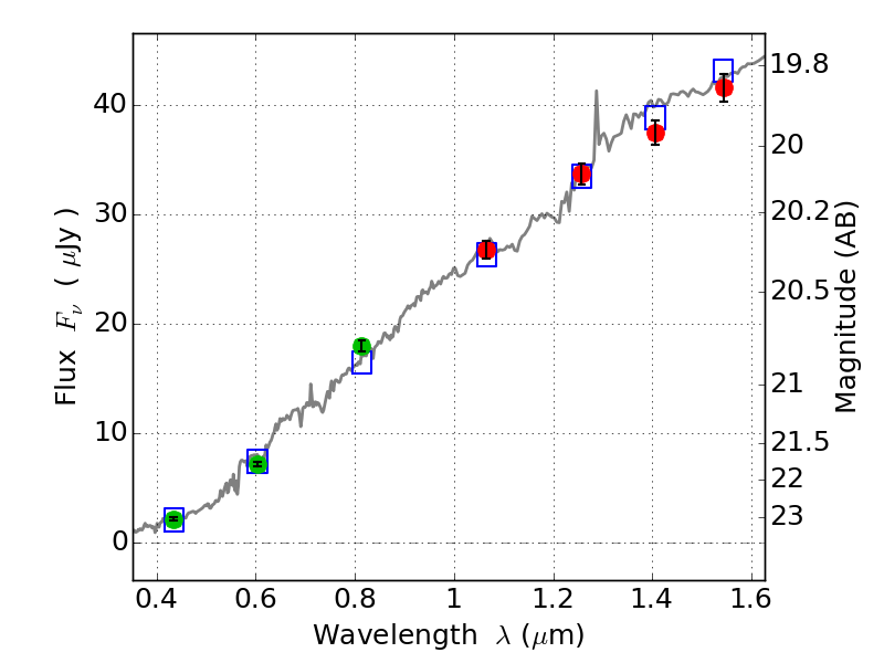 Object #1617 x,y = (2294, 3283) RA, Dec = (00:32:12.120, 18:08:39.84) = (8.05050, 18.14440) BPZ = 0.425 [0.327--0.502] type = 5.90 (Sbc_B10 - ES0_B10) chisq2 = 0.19 ODDS = 0.72 z_cluster = 0.396