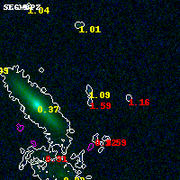 Object #2202 x,y = (1228, 2858) RA, Dec = (00:32:16.608, 18:08:14.28) = (8.06920, 18.13730) BPZ = 1.088 [0.569--2.506] type = 10.60 (SB11_A_0_l - SB3_B10) chisq2 = 0.01 ODDS = 0.16 z_cluster = 0.396