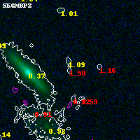 Object #2224 x,y = (1229, 2846) RA, Dec = (00:32:16.608, 18:08:13.56) = (8.06920, 18.13710) BPZ = 1.592 [1.163--2.526] type = 11.00 (SB11_A_0_l) chisq2 = 1.40 ODDS = 0.20 z_cluster = 0.396