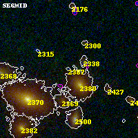 Object #2387 x,y = (2758, 2780) RA, Dec = (00:32:10.176, 18:08:09.60) = (8.04240, 18.13600) BPZ = 0.105 [0.095--2.526] type = 11.00 (SB11_A_0_l) chisq2 = 13.25 ODDS = 0.12 z_cluster = 0.396