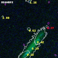 Object #2555 x,y = (4490, 2698) RA, Dec = (00:32:02.880, 18:08:04.56) = (8.01200, 18.13460) BPZ = 0.617 [0.232--1.681] type = 7.70 (SB1_B10 - Scd_B10) chisq2 = 0.01 ODDS = 0.21 z_cluster = 0.396