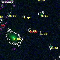 Object #2576 x,y = (763, 2686) RA, Dec = (00:32:18.576, 18:08:03.84) = (8.07740, 18.13440) BPZ = 0.933 [0.327--2.568] type = 11.00 (SB11_A_0_l) chisq2 = 1.13 ODDS = 0.13 z_cluster = 0.396