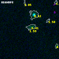 Object #2662 x,y = (4267, 2627) RA, Dec = (00:32:03.816, 18:08:00.60) = (8.01590, 18.13350) BPZ = 1.594 [0.202--3.133] type = 9.50 (SB3_B10 - SB2_B10) chisq2 = 0.04 ODDS = 0.10 z_cluster = 0.396