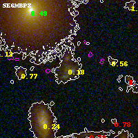 Object #2693 x,y = (2493, 2413) RA, Dec = (00:32:11.280, 18:07:47.64) = (8.04700, 18.12990) BPZ = 0.180 [0.071--0.277] type = 9.00 (SB2_B10) chisq2 = 0.33 ODDS = 0.69 z_cluster = 0.396