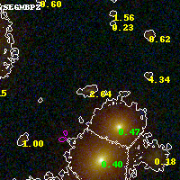 Object #2975 x,y = (2700, 2504) RA, Dec = (00:32:10.416, 18:07:53.04) = (8.04340, 18.13140) BPZ = 2.639 [2.354--2.933] type = 9.20 (SB2_B10 - SB3_B10) chisq2 = 0.14 ODDS = 0.73 z_cluster = 0.396