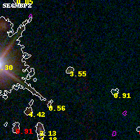 Object #3009 x,y = (3561, 2488) RA, Dec = (00:32:06.792, 18:07:52.32) = (8.02830, 18.13120) BPZ = 3.551 [0.347--3.881] type = 10.00 (SB3_B10) chisq2 = 0.85 ODDS = 0.78 z_cluster = 0.396