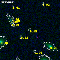 Object #3096 x,y = (990, 2475) RA, Dec = (00:32:17.616, 18:07:51.24) = (8.07340, 18.13090) BPZ = 0.450 [0.142--3.139] type = 9.30 (SB2_B10 - SB3_B10) chisq2 = 0.05 ODDS = 0.10 z_cluster = 0.396