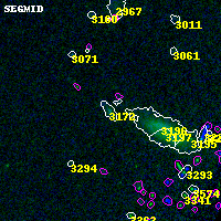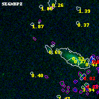Object #3172 x,y = (4384, 2405) RA, Dec = (00:32:03.336, 18:07:47.28) = (8.01390, 18.12980) BPZ = 0.631 [0.431--1.608] type = 8.20 (SB1_B10 - SB2_B10) chisq2 = 0.00 ODDS = 0.45 z_cluster = 0.396