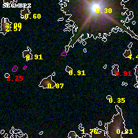 Object #3186 x,y = (3417, 2407) RA, Dec = (00:32:07.392, 18:07:47.28) = (8.03080, 18.12980) BPZ = 0.911 [0.258--1.101] type = 9.90 (SB3_B10 - SB2_B10) chisq2 = 0.20 ODDS = 0.36 z_cluster = 0.396