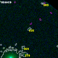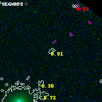 Object #335 x,y = (2614, 4403) RA, Dec = (00:32:10.776, 18:09:47.16) = (8.04490, 18.16310) BPZ = 0.914 [0.559--1.639] type = 8.40 (SB1_B10 - SB2_B10) chisq2 = 0.24 ODDS = 0.26 z_cluster = 0.396