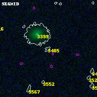 Object #3405 x,y = (1315, 2294) RA, Dec = (00:32:16.248, 18:07:40.44) = (8.06770, 18.12790) BPZ = 1.034 [0.484--2.570] type = 11.00 (SB11_A_0_l) chisq2 = 0.87 ODDS = 0.13 z_cluster = 0.396