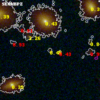 Object #3510 x,y = (1830, 2241) RA, Dec = (00:32:14.088, 18:07:37.20) = (8.05870, 18.12700) BPZ = 0.448 [0.104--3.577] type = 9.30 (SB2_B10 - SB3_B10) chisq2 = 0.15 ODDS = 0.11 z_cluster = 0.396