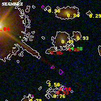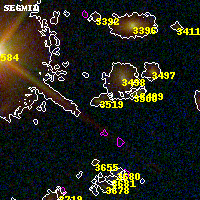 Object #3519 x,y = (2184, 2215) RA, Dec = (00:32:12.600, 18:07:35.76) = (8.05250, 18.12660) BPZ = 3.845 [3.406--4.263] type = 9.30 (SB2_B10 - SB3_B10) chisq2 = 2.57 ODDS = 0.56 z_cluster = 0.396