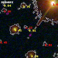 Object #3738 x,y = (1997, 2172) RA, Dec = (00:32:13.368, 18:07:33.24) = (8.05570, 18.12590) BPZ = 0.910 [0.320--1.130] type = 9.70 (SB3_B10 - SB2_B10) chisq2 = 0.37 ODDS = 0.35 z_cluster = 0.396