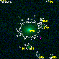 Object #378 x,y = (2552, 4305) RA, Dec = (00:32:11.040, 18:09:41.04) = (8.04600, 18.16140) BPZ = 0.437 [0.339--0.477] type = 4.50 (ES0_B10 - Ell4_A_0) chisq2 = 0.00 ODDS = 0.82 z_cluster = 0.396