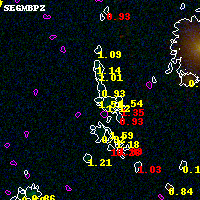Object #4087 x,y = (1571, 1858) RA, Dec = (00:32:15.168, 18:07:14.16) = (8.06320, 18.12060) BPZ = 1.508 [0.241--2.813] type = 9.80 (SB3_B10 - SB2_B10) chisq2 = 0.23 ODDS = 0.11 z_cluster = 0.396