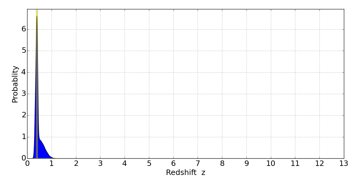 In P(z) plots: Yellow lines mark the cluster redshift z = 0.396,