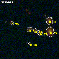 Object #4369 x,y = (3237, 1727) RA, Dec = (00:32:08.160, 18:07:06.60) = (8.03400, 18.11850) BPZ = 0.530 [0.257--0.761] type = 8.20 (SB1_B10 - SB2_B10) chisq2 = 0.74 ODDS = 0.40 z_cluster = 0.396