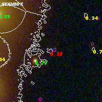 Object #4394 x,y = (2603, 1683) RA, Dec = (00:32:10.824, 18:07:03.72) = (8.04510, 18.11770) BPZ = 0.098 [0.086--2.722] type = 11.00 (SB11_A_0_l) chisq2 = 1.58 ODDS = 0.13 z_cluster = 0.396