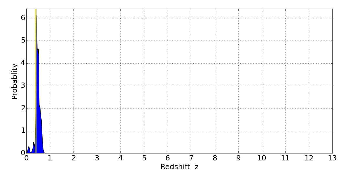 In P(z) plots: Yellow lines mark the cluster redshift z = 0.396,