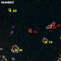 Object #4620 x,y = (3229, 1549) RA, Dec = (00:32:08.184, 18:06:55.80) = (8.03410, 18.11550) BPZ = 0.907 [0.451--1.118] type = 8.70 (SB2_B10 - SB1_B10) chisq2 = 1.30 ODDS = 0.49 z_cluster = 0.396