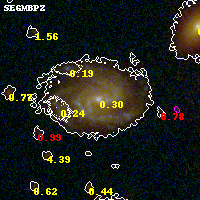 Object #4833 x,y = (2229, 1357) RA, Dec = (00:32:12.408, 18:06:44.28) = (8.05170, 18.11230) BPZ = 0.299 [0.225--0.408] type = 7.50 (SB1_B10 - Scd_B10) chisq2 = 0.11 ODDS = 0.74 z_cluster = 0.396