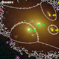 Object #4856 x,y = (2911, 1538) RA, Dec = (00:32:09.528, 18:06:55.08) = (8.03970, 18.11530) BPZ = 0.402 [0.367--0.457] type = 5.10 (ES0_B10 - Sbc_B10) chisq2 = 0.03 ODDS = 0.98 z_cluster = 0.396