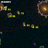Object #4895 x,y = (3509, 1354) RA, Dec = (00:32:07.008, 18:06:43.92) = (8.02920, 18.11220) BPZ = 0.906 [0.422--1.059] type = 9.60 (SB3_B10 - SB2_B10) chisq2 = 0.57 ODDS = 0.36 z_cluster = 0.396