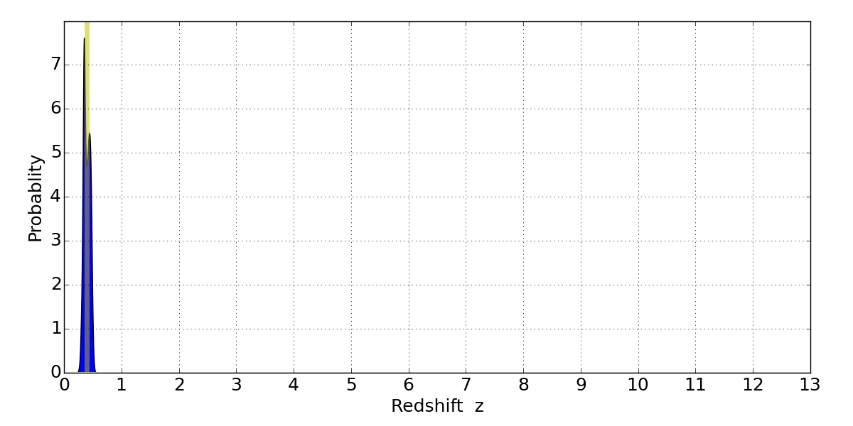 In P(z) plots: Yellow lines mark the cluster redshift z = 0.396,