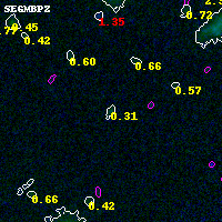 Object #5187 x,y = (3487, 1099) RA, Dec = (00:32:07.104, 18:06:28.80) = (8.02960, 18.10800) BPZ = 0.308 [0.161--3.502] type = 8.10 (SB1_B10 - SB2_B10) chisq2 = 0.07 ODDS = 0.21 z_cluster = 0.396