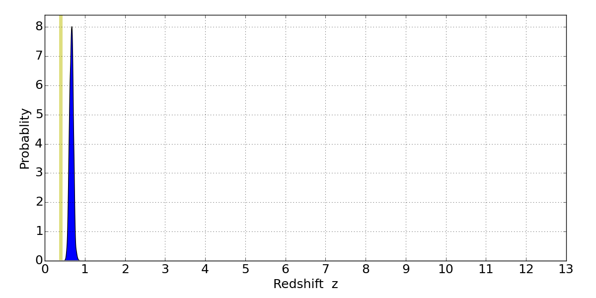 In P(z) plots: Yellow lines mark the cluster redshift z = 0.396,