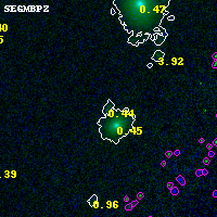 Object #5465 x,y = (3421, 881) RA, Dec = (00:32:07.392, 18:06:15.84) = (8.03080, 18.10440) BPZ = 0.441 [0.113--3.136] type = 8.80 (SB2_B10 - SB1_B10) chisq2 = 0.00 ODDS = 0.23 z_cluster = 0.396