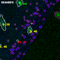 Object #5773 x,y = (3326, 525) RA, Dec = (00:32:07.776, 18:05:54.24) = (8.03240, 18.09840) BPZ = 0.401 [0.196--3.354] type = 6.10 (Sbc_B10 - Scd_B10) chisq2 = 0.00 ODDS = 0.19 z_cluster = 0.396
