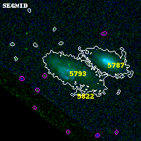 Object #5793 x,y = (2458, 487) RA, Dec = (00:32:11.424, 18:05:52.08) = (8.04760, 18.09780) BPZ = 0.299 [0.232--0.386] type = 8.10 (SB1_B10 - SB2_B10) chisq2 = 0.04 ODDS = 0.82 z_cluster = 0.396