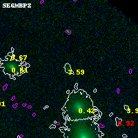 Object #716 x,y = (3256, 3900) RA, Dec = (00:32:08.064, 18:09:16.92) = (8.03360, 18.15470) BPZ = 3.588 [0.218--3.931] type = 7.90 (SB1_B10 - Scd_B10) chisq2 = 0.02 ODDS = 0.70 z_cluster = 0.396