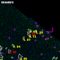 Object #724 x,y = (3396, 3894) RA, Dec = (00:32:07.488, 18:09:16.56) = (8.03120, 18.15460) BPZ = 0.665 [0.235--2.182] type = 8.90 (SB2_B10 - SB1_B10) chisq2 = 0.06 ODDS = 0.13 z_cluster = 0.396