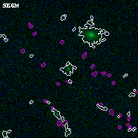 Object #844 x,y = (3141, 3854) RA, Dec = (00:32:08.568, 18:09:14.04) = (8.03570, 18.15390) BPZ = 0.914 [0.745--1.451] type = 8.10 (SB1_B10 - SB2_B10) chisq2 = 0.02 ODDS = 0.39 z_cluster = 0.396