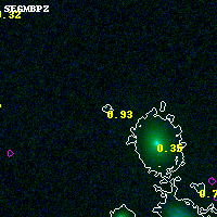 Object #850 x,y = (2164, 3779) RA, Dec = (00:32:12.672, 18:09:09.72) = (8.05280, 18.15270) BPZ = 0.932 [0.195--2.637] type = 9.90 (SB3_B10 - SB2_B10) chisq2 = 0.46 ODDS = 0.12 z_cluster = 0.396