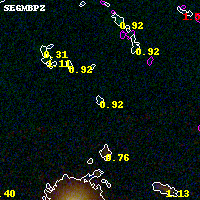Object #949 x,y = (3105, 3710) RA, Dec = (00:32:08.712, 18:09:05.40) = (8.03630, 18.15150) BPZ = 0.920 [0.211--2.327] type = 9.90 (SB3_B10 - SB2_B10) chisq2 = 0.77 ODDS = 0.15 z_cluster = 0.396