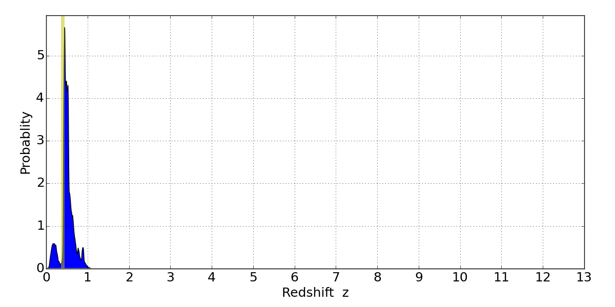 In P(z) plots: Yellow lines mark the cluster redshift z = 0.396,