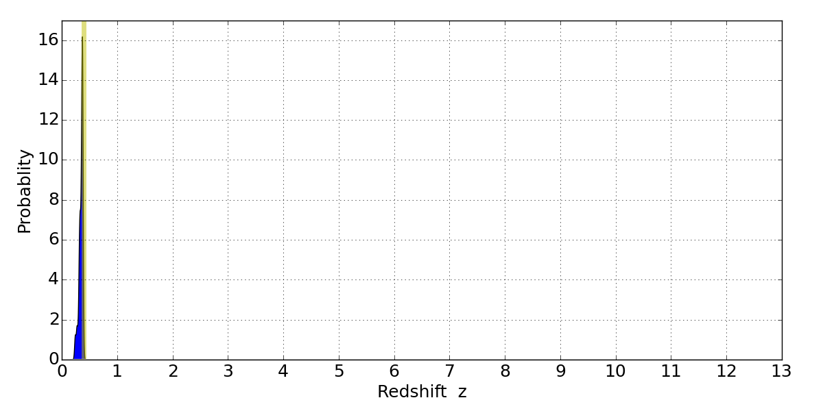 In P(z) plots: Yellow lines mark the cluster redshift z = 0.396,