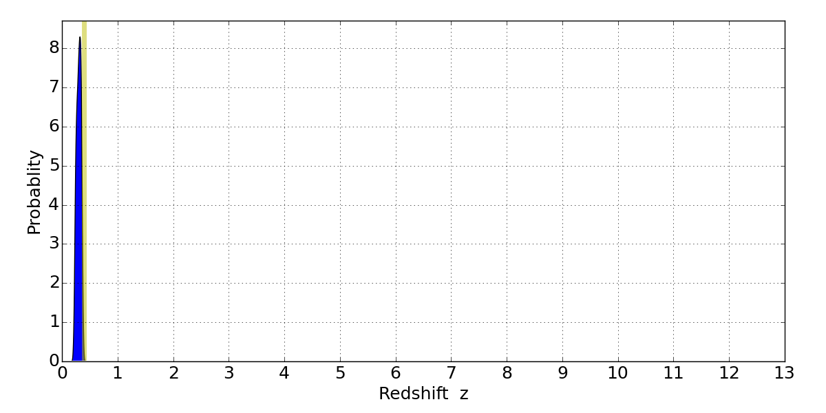In P(z) plots: Yellow lines mark the cluster redshift z = 0.396,