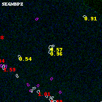 Object #1259 x,y = (3853, 3428) RA, Dec = (00:32:05.568, 18:08:48.48) = (8.02320, 18.14680) BPZ = 0.958 [0.521--1.739] type = 8.90 (SB2_B10 - SB1_B10) chisq2 = 0.04 ODDS = 0.21 z_cluster = 0.396