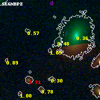 Object #1263 x,y = (1474, 3435) RA, Dec = (00:32:15.576, 18:08:48.84) = (8.06490, 18.14690) BPZ = 1.052 [0.206--2.841] type = 10.20 (SB3_B10 - SB11_A_0_l) chisq2 = 0.38 ODDS = 0.09 z_cluster = 0.396