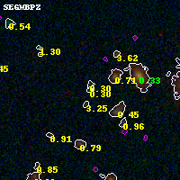 Object #1266 x,y = (1763, 3428) RA, Dec = (00:32:14.352, 18:08:48.48) = (8.05980, 18.14680) BPZ = 0.303 [0.127--4.023] type = 11.00 (SB11_A_0_l) chisq2 = 0.61 ODDS = 0.13 z_cluster = 0.396