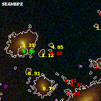 Object #1587 x,y = (2664, 3191) RA, Dec = (00:32:10.560, 18:08:34.44) = (8.04400, 18.14290) BPZ = 0.133 [0.098--4.890] type = 10.80 (SB11_A_0_l - SB3_B10) chisq2 = 3.91 ODDS = 0.31 z_cluster = 0.396