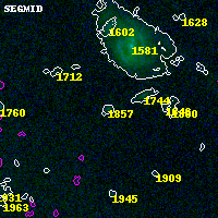 Object #1857 x,y = (4066, 3085) RA, Dec = (00:32:04.656, 18:08:27.96) = (8.01940, 18.14110) BPZ = 0.597 [0.229--1.771] type = 8.20 (SB1_B10 - SB2_B10) chisq2 = 0.01 ODDS = 0.25 z_cluster = 0.396