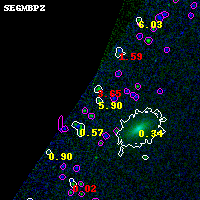 Object #1913 x,y = (930, 3312) RA, Dec = (00:32:17.856, 18:08:41.64) = (8.07440, 18.14490) BPZ = 5.899 [5.532--8.955] type = 8.70 (SB2_B10 - SB1_B10) chisq2 = 0.07 ODDS = 0.41 z_cluster = 0.396