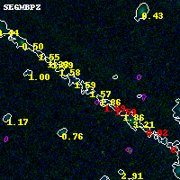Object #2090 x,y = (4447, 2914) RA, Dec = (00:32:03.072, 18:08:17.52) = (8.01280, 18.13820) BPZ = 1.572 [1.038--2.637] type = 10.40 (SB3_B10 - SB11_A_0_l) chisq2 = 0.04 ODDS = 0.15 z_cluster = 0.396