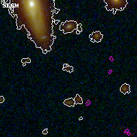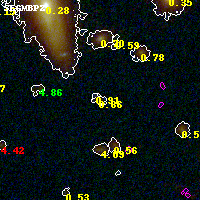 Object #2105 x,y = (1939, 2940) RA, Dec = (00:32:13.608, 18:08:19.32) = (8.05670, 18.13870) BPZ = 0.658 [0.152--1.107] type = 8.80 (SB2_B10 - SB1_B10) chisq2 = 0.23 ODDS = 0.19 z_cluster = 0.396